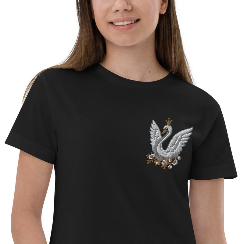 Love the ballet Swan Lake? Or simply love pretty things? This delicately embroidered swan tee is waiting just for you! Made from comfortable jersey fabric, this 100% cotton t-shirt is sure to be a favorite. Use it as the perfect cover up for your dance outfit or as a cute fashion staple.